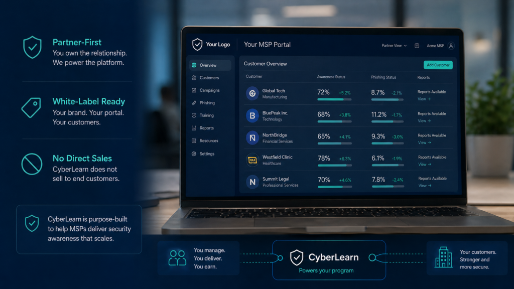 That helps MSPs present CyberLearn as part of their own cybersecurity service portfolio.